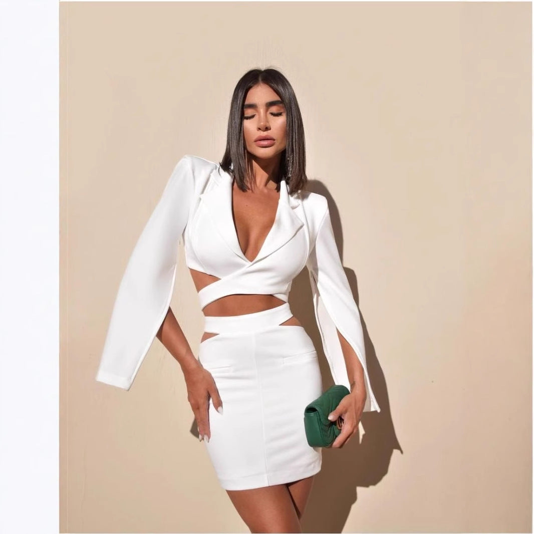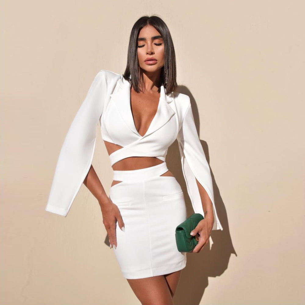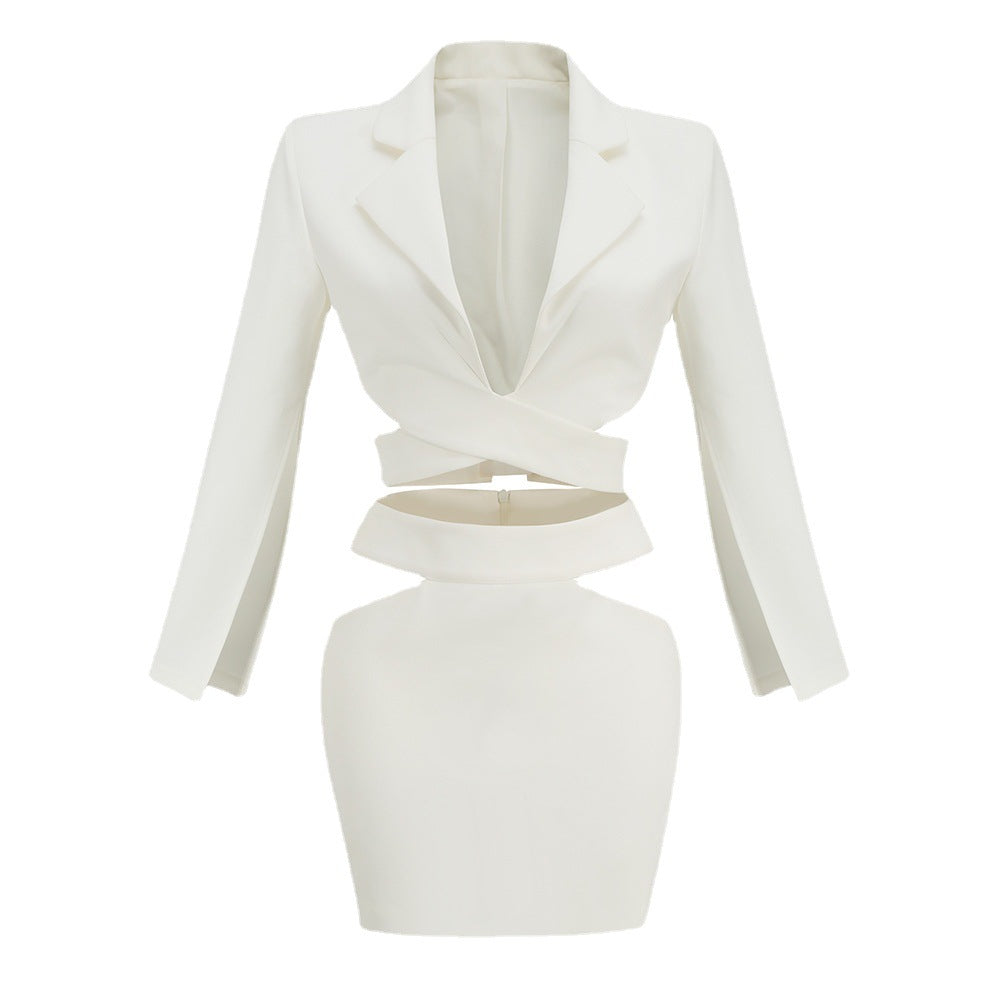 Diynav Women's Sexy Ass Dress Female White High-End Temperament Long-Sleeved Small Suit Dress Skirt