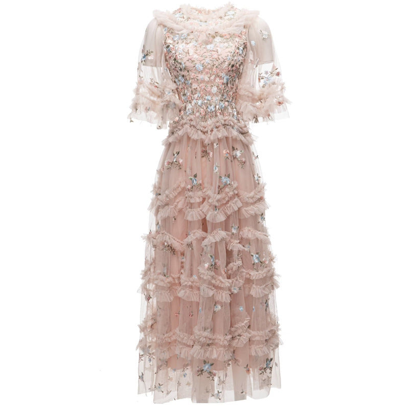 Diynav Industry Embroidered Short Sleeve Splicing Round Collar Lotus Leaf Side Long Dress Dress Autumn And Winter Women's Dress New