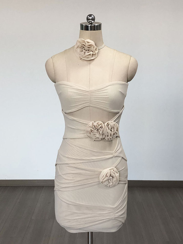 Diynav Sexy Boobs Mesh Flowers Design Short Skirt Hollow Folded Back Wrinkle Body Hip Skirt