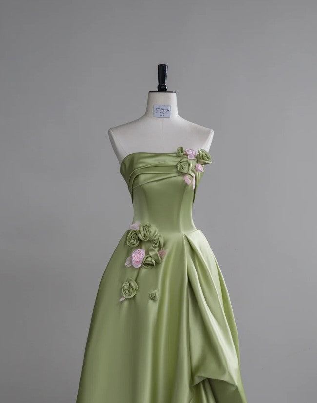 Beautiful Green A-Line Strapless Satin Applique Long Prom Dress Cute Birthday Dress Formal Evening Dress HZ1108