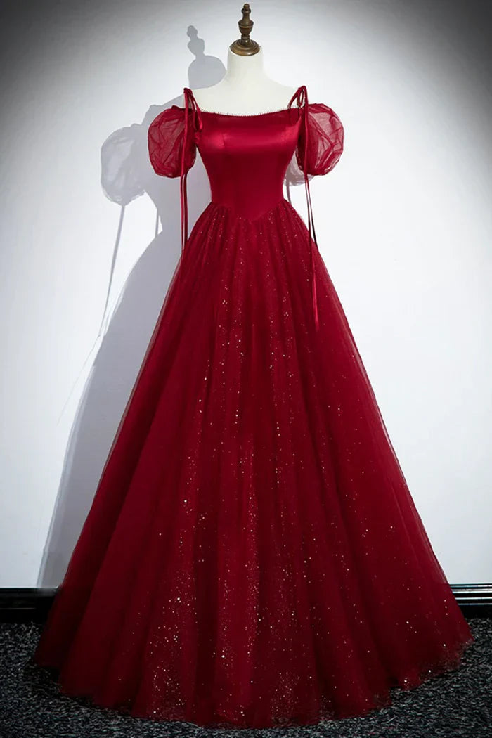 Burgundy A-Line Satin Tulle Floor Length Prom Dress, Off Shoulder Formal Evening Dress HZ1108