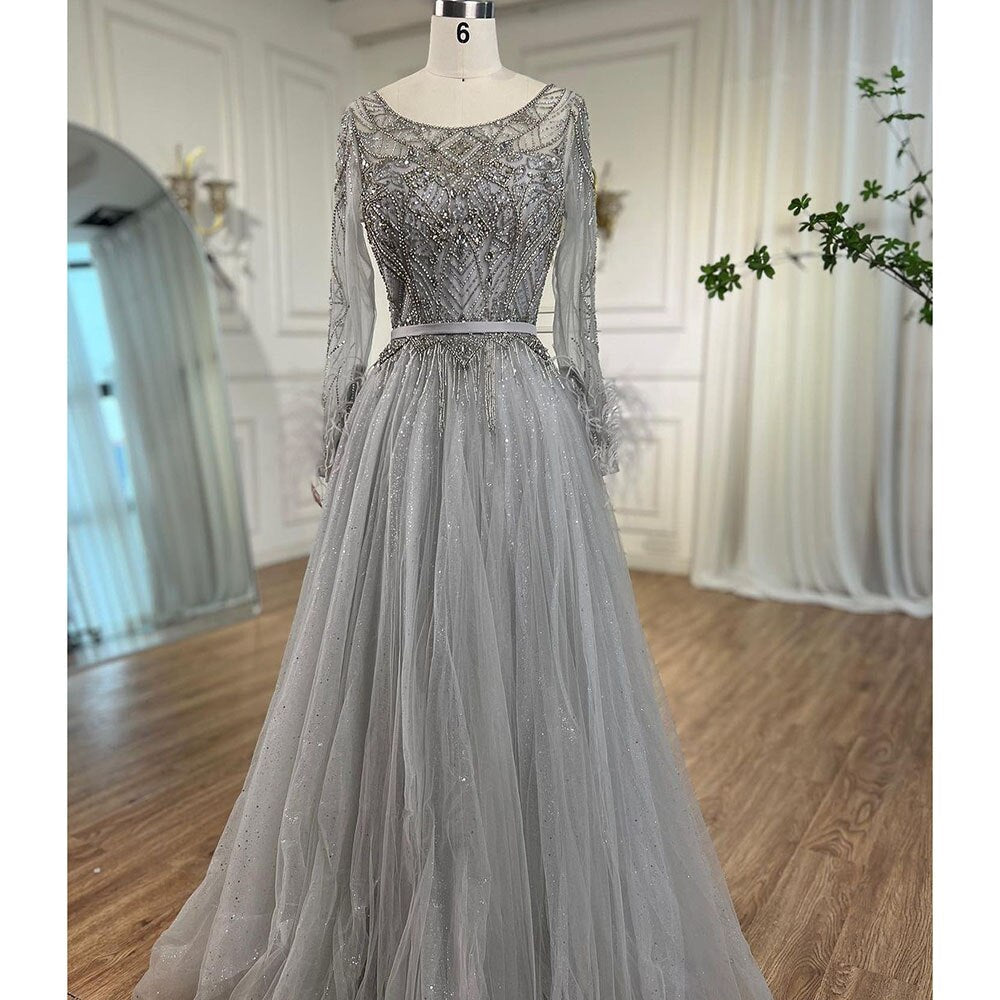Diynav A-Line Beading Feathers Design Evening Dresses 2025 Dubai Long Sleeves Luxury Formal Dress HZ1017
