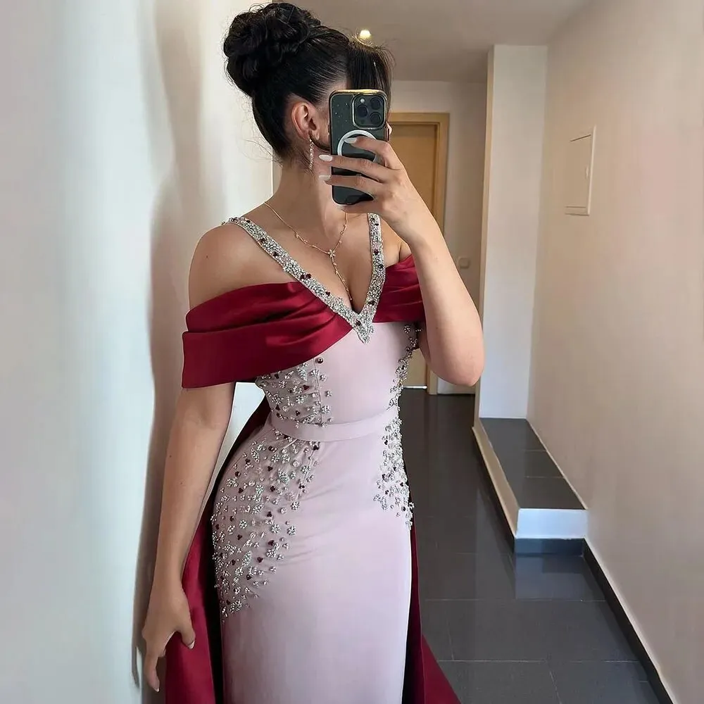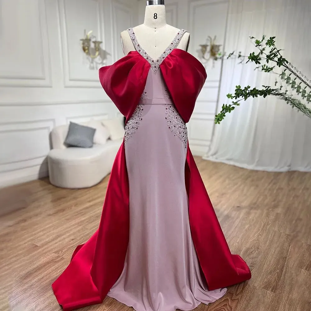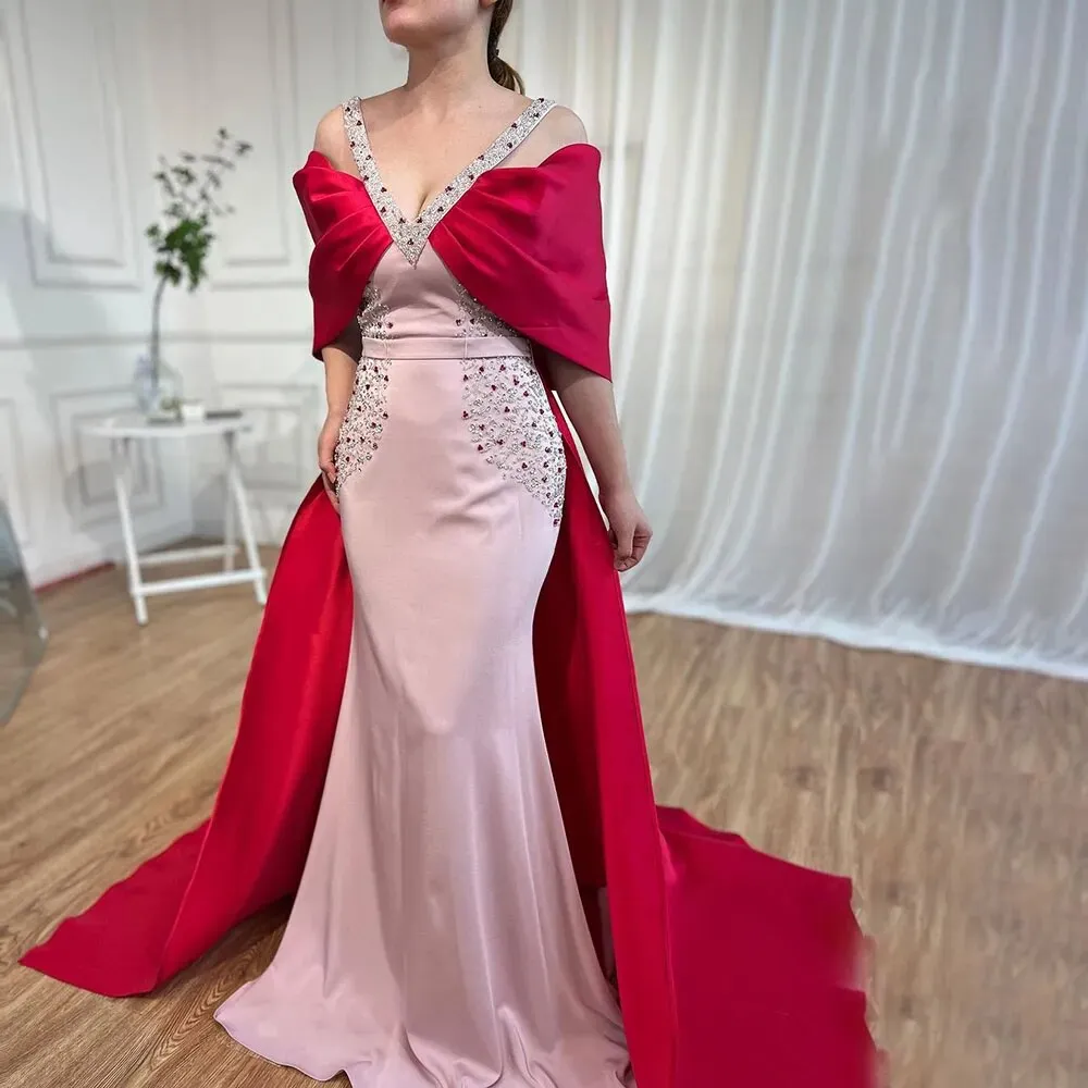 Experience elegance and luxury with the Arabic Pink Burgundy Mermaid Evening Dress. Featuring a stunning cape and figure-flattering mermaid silhouette. this dress is perfect for weddings. parties. and other special occasions. Make a statement and feel like a princess in this one-of-a-kind gown.