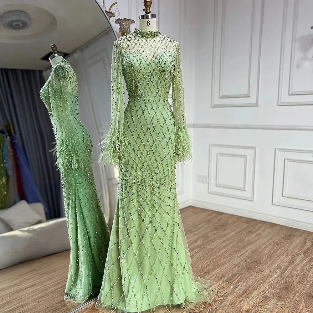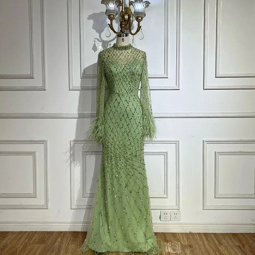 Indulge in luxury with our Evening Dress. Adorned with exquisite beads and feathers. this sage green dress exudes elegance with its long sleeves and high neck. Perfect for formal events or special occasions. this dress is a must-have for those seeking a touch of glamour.