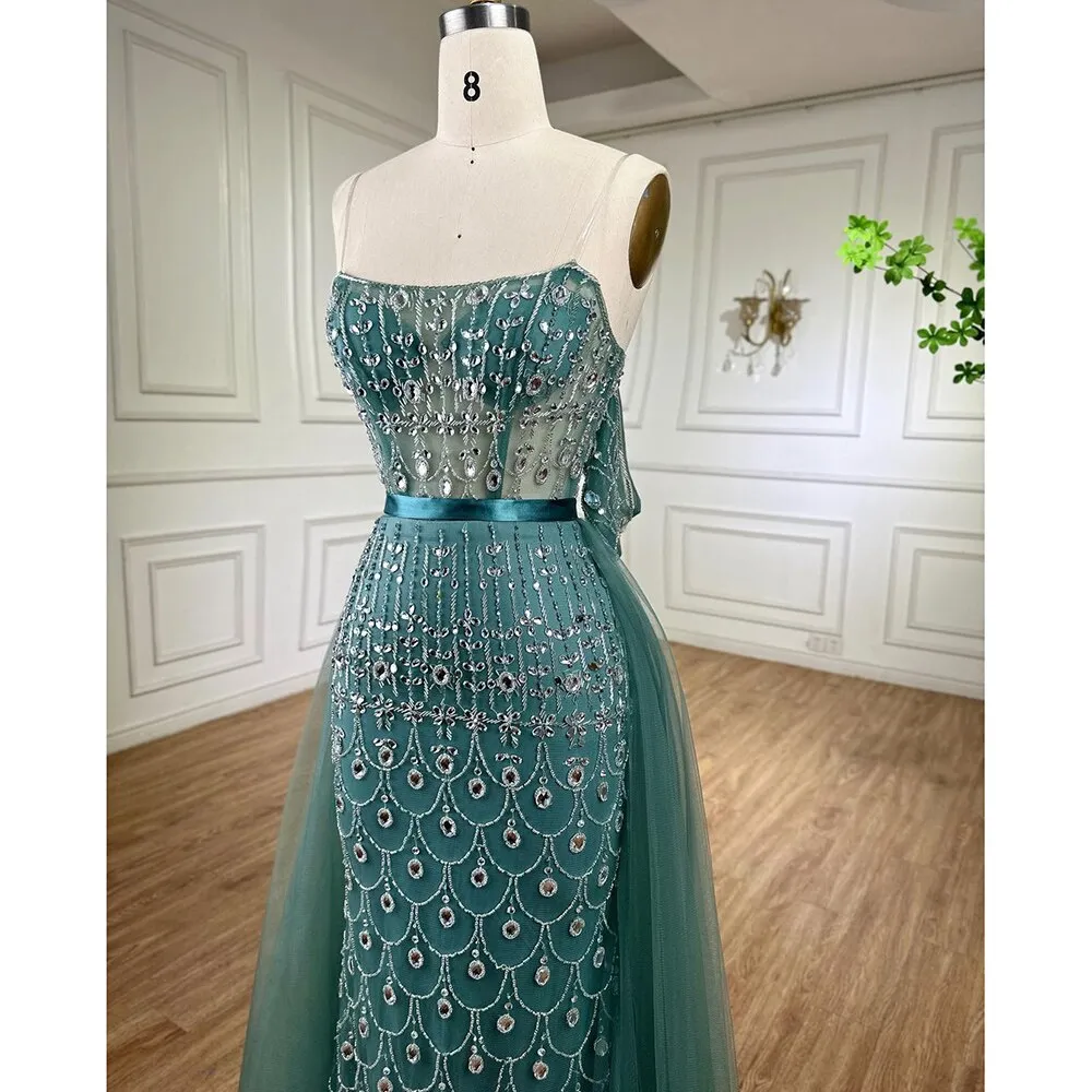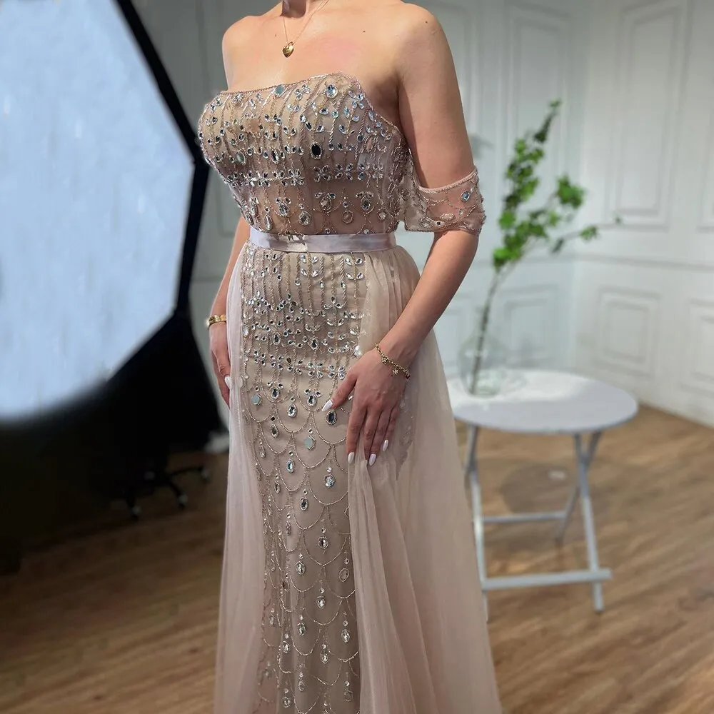 ?Its luxurious champagne color. intricate mermaid design. and added overskirt will make you stand out at any event. The perfect choice for a sophisticated and glamorous look.