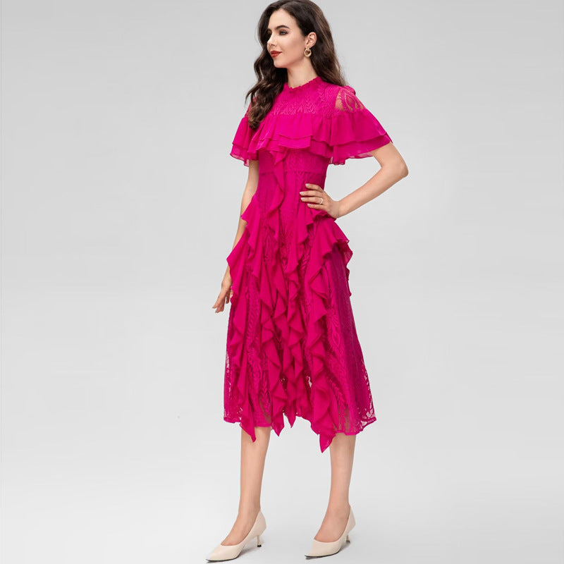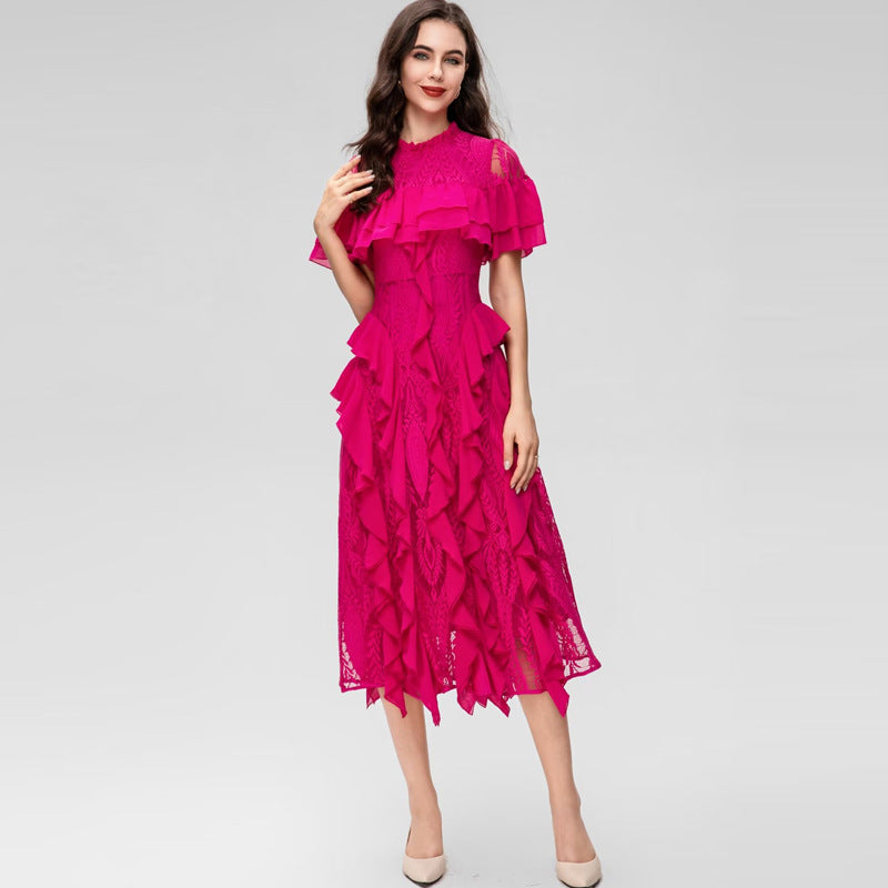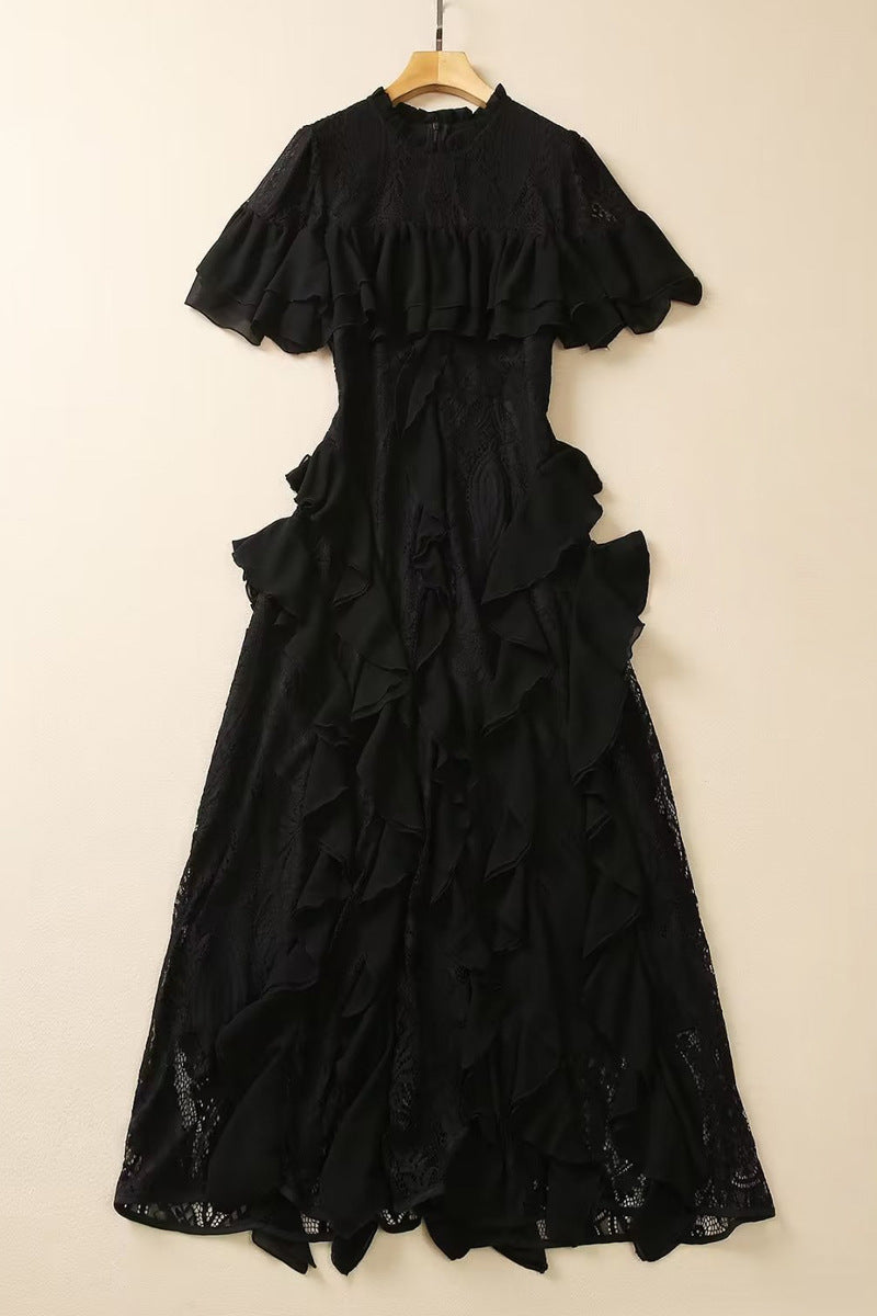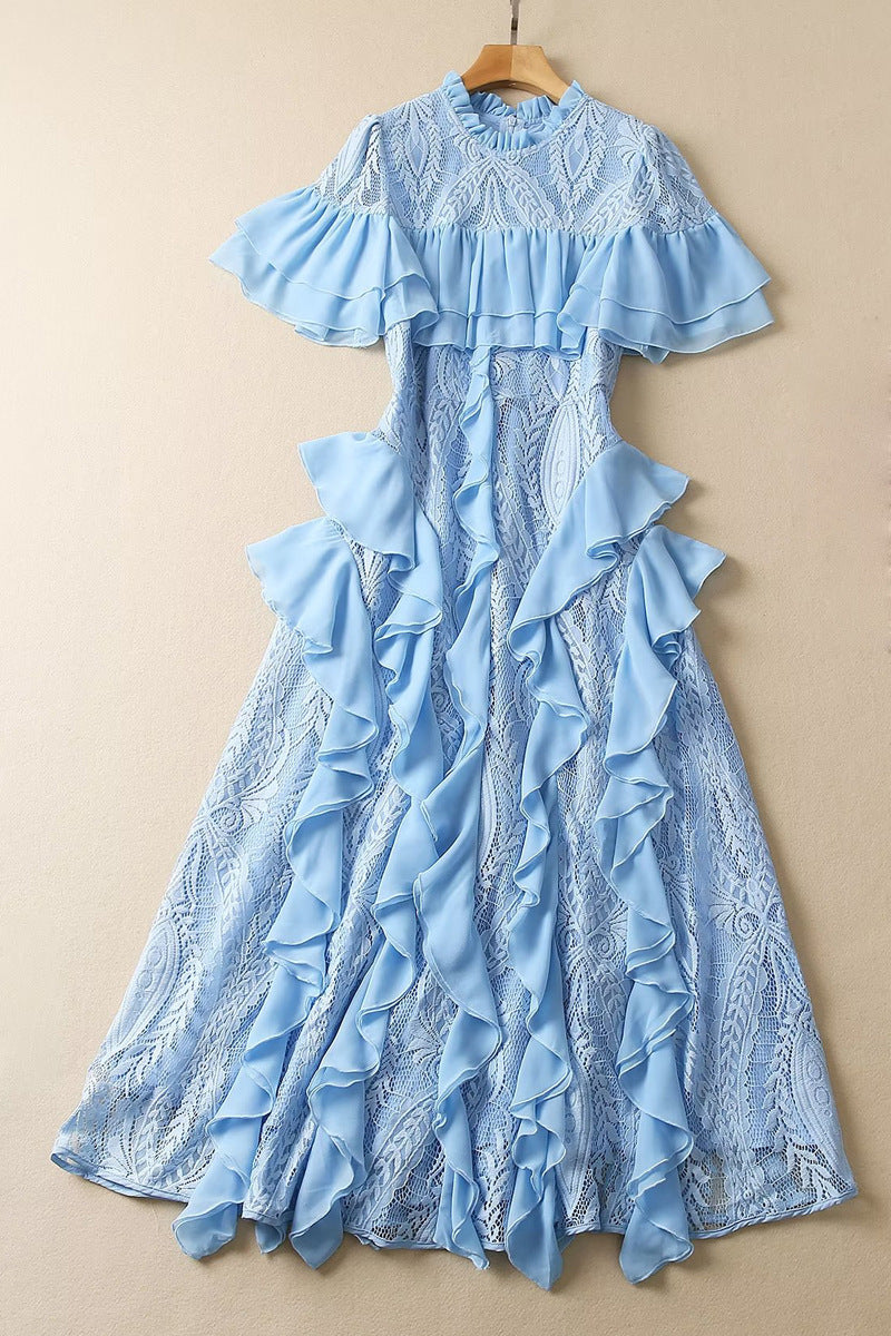 Diynav Collar Short-Sleeved Heavyweight Hook Flower Stacked Lotus Leaf Lace Blue Dress Women's New Spring And Summer 2025