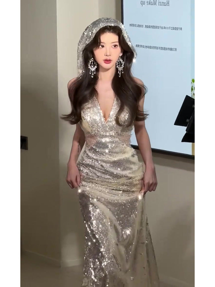 Diynav Dress Woman 2024 New High-End Squin Silver High-End Feeling Light Luxury Banquet Temperament Long Dress Bridal Toast