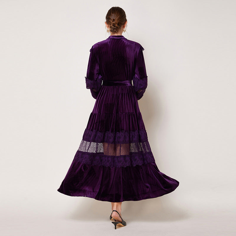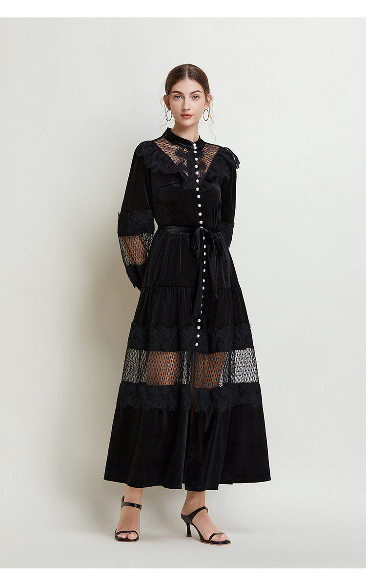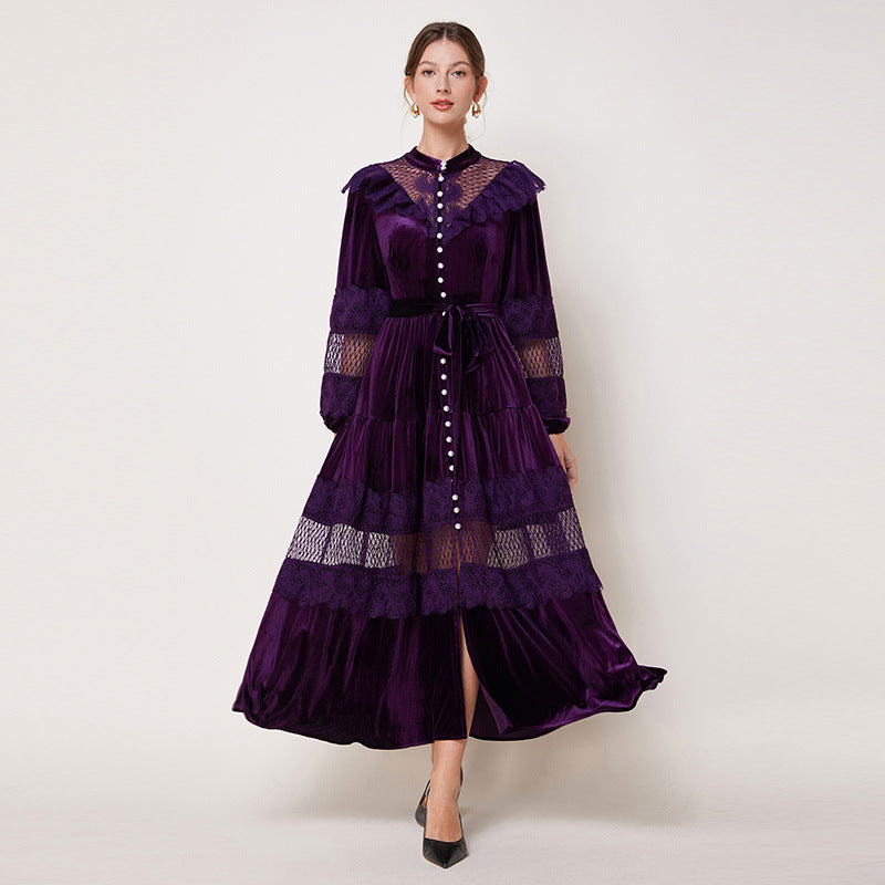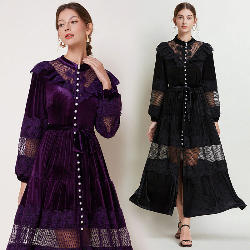 Diynav Dress Women's French Retro Fashion Collar Pearl Single Buckle Lace Splicing Velvet Swoon Long Dress