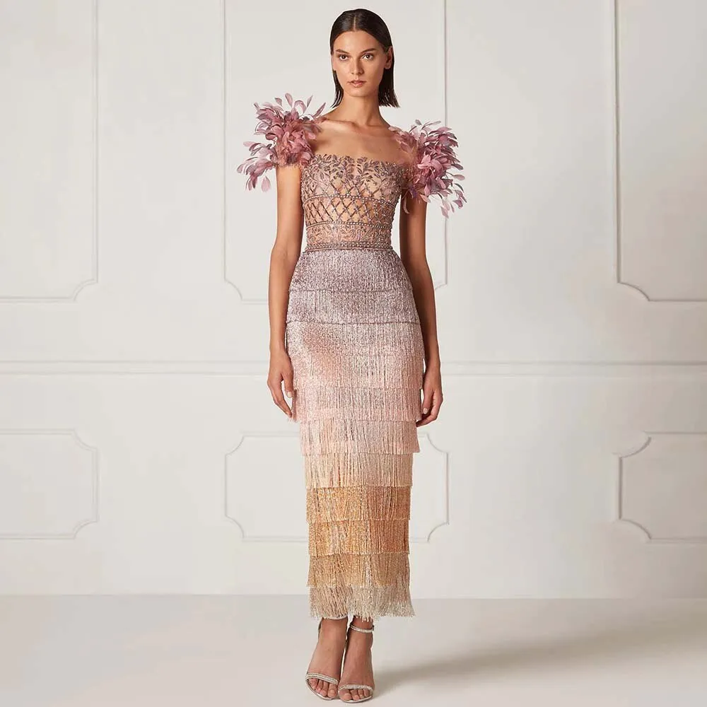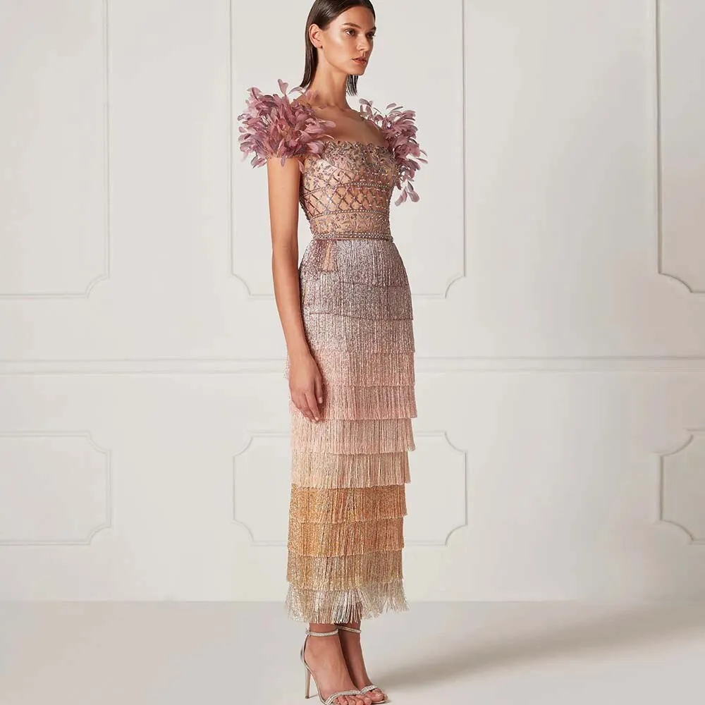 Featuring luxurious feathers and tassels. this dress is perfect for weddings. parties. and formal events. Make a statement with the ankle length midi design and be the center of attention.