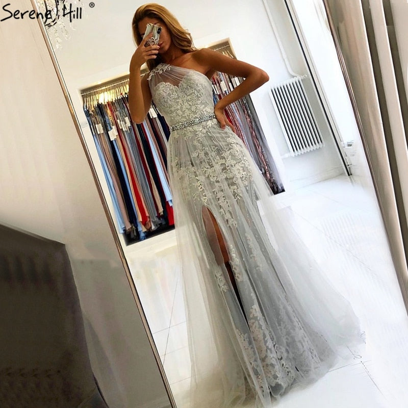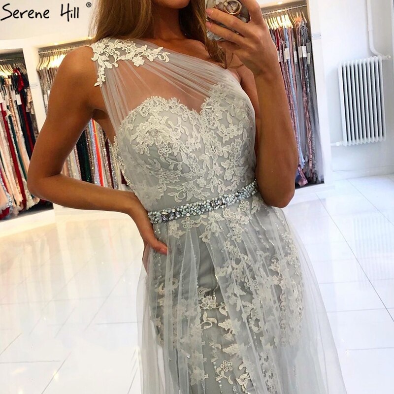 Diynav Grey Mermaid Elegant Evening Dresses Gowns 2025 One Shoulder Lace Sexy Pearls For Women Party HZ1017