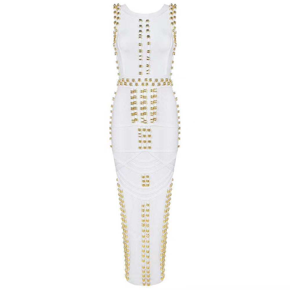 Diynav Industry Nail Pearl Dress Long Round-Neck Sleeveless Metal Buckle Beads After Opening Banquet Banding Dress