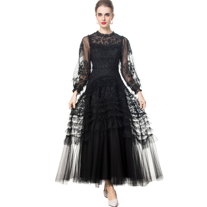 Diynav Industry Water-Soluble Flowers Hollow Long-Sleeved Lotus Side Princess Wind Black Dress New Women's Spring And Summer 2025
