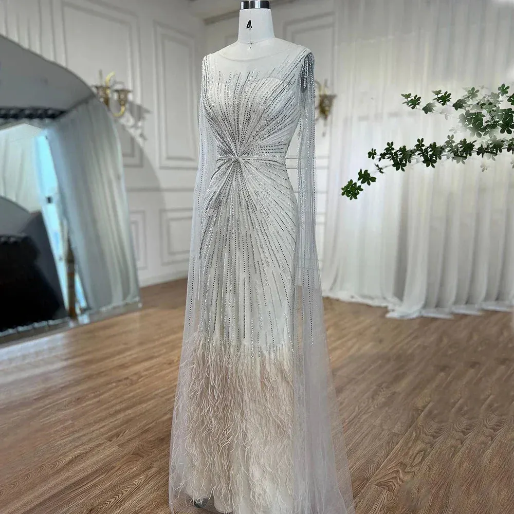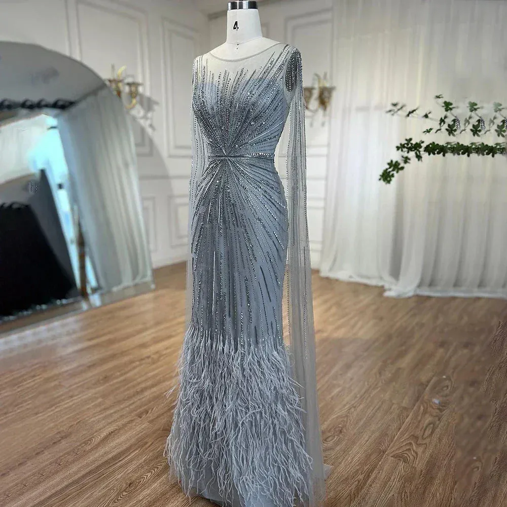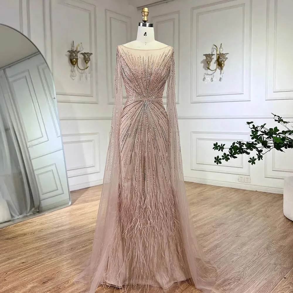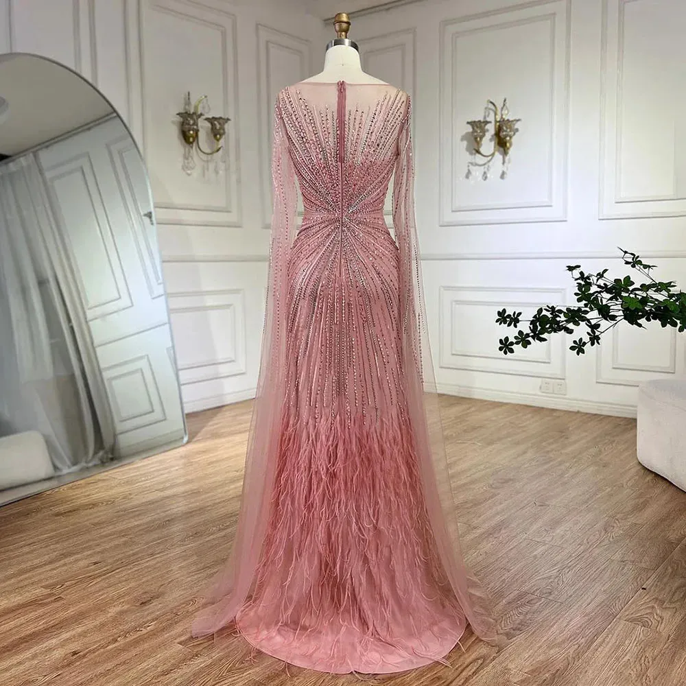 Indulge in luxury with our SERENE HILL evening dress. The lilac feathers and cape sleeves add a touch of elegance to this Arabic inspired gown. Perfect for weddings. parties. or prom. our dress will make you feel like a princess. Experience the magic of style and comfort with Dreamy Vow.