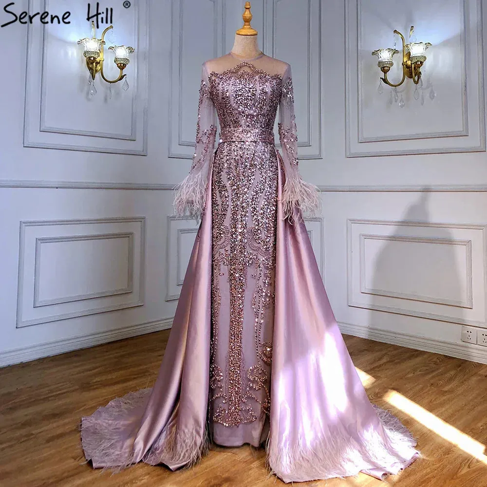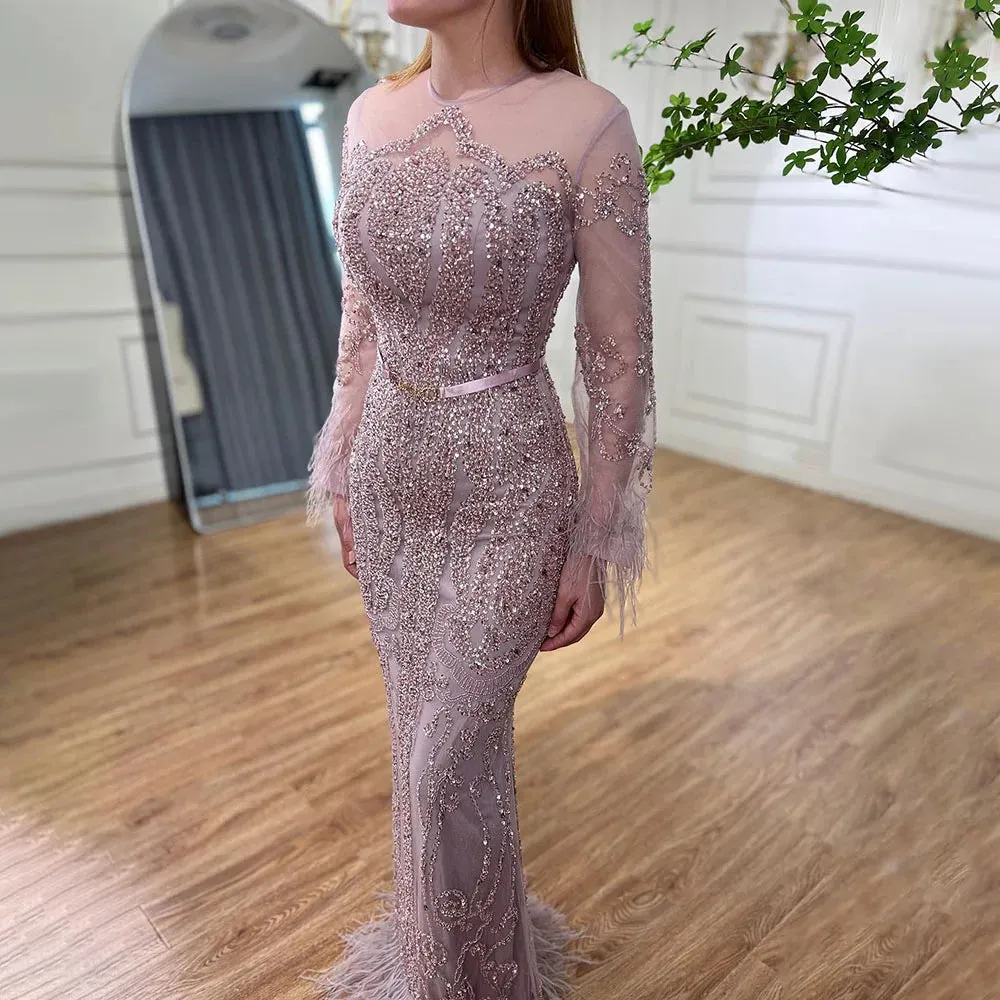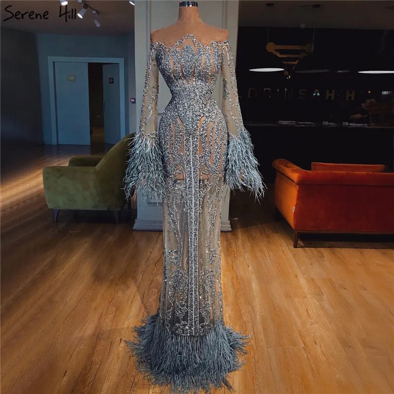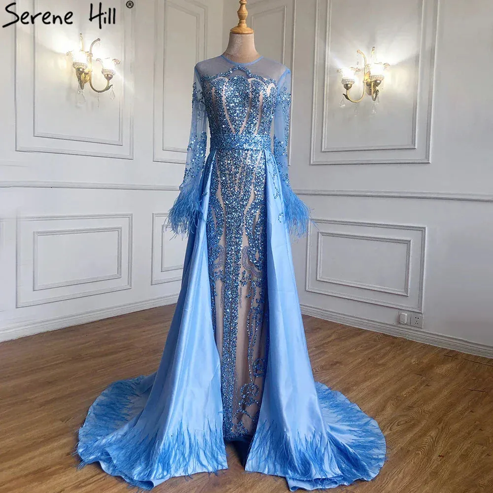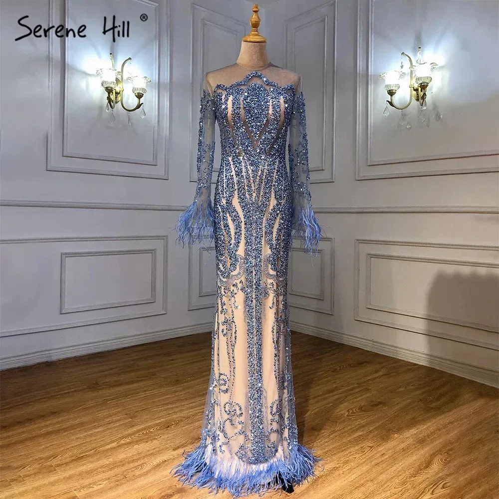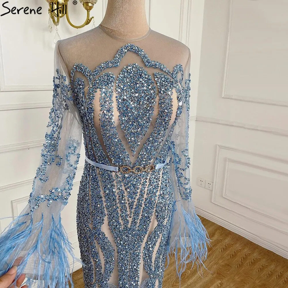 Blue ?Long Sleeve Feathers beaded Evening Dresses Dubai Mermaid Luxury Evening Gowns 2025 LA60932