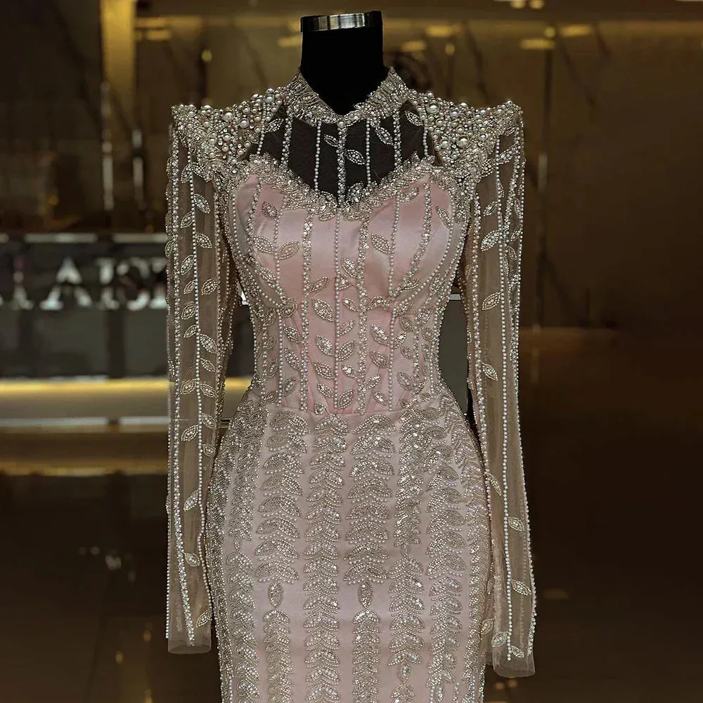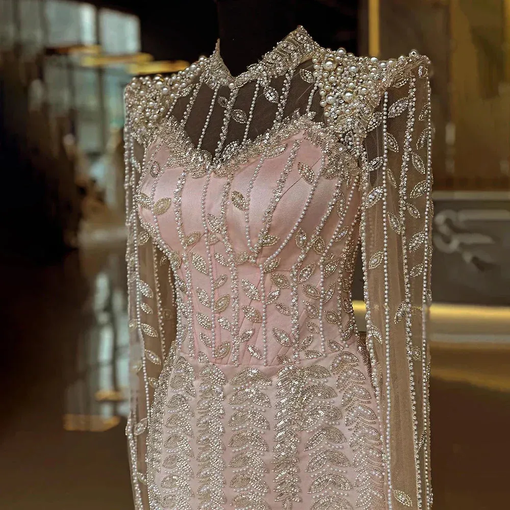 The beige color and long sleeves add elegance. while the Arabic-inspired design is perfect for Muslim women. Ideal for weddings and parties. this dress is fit for a queen.