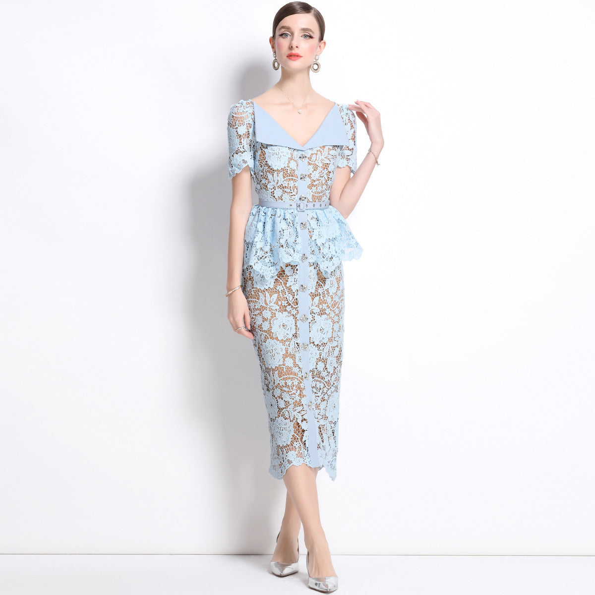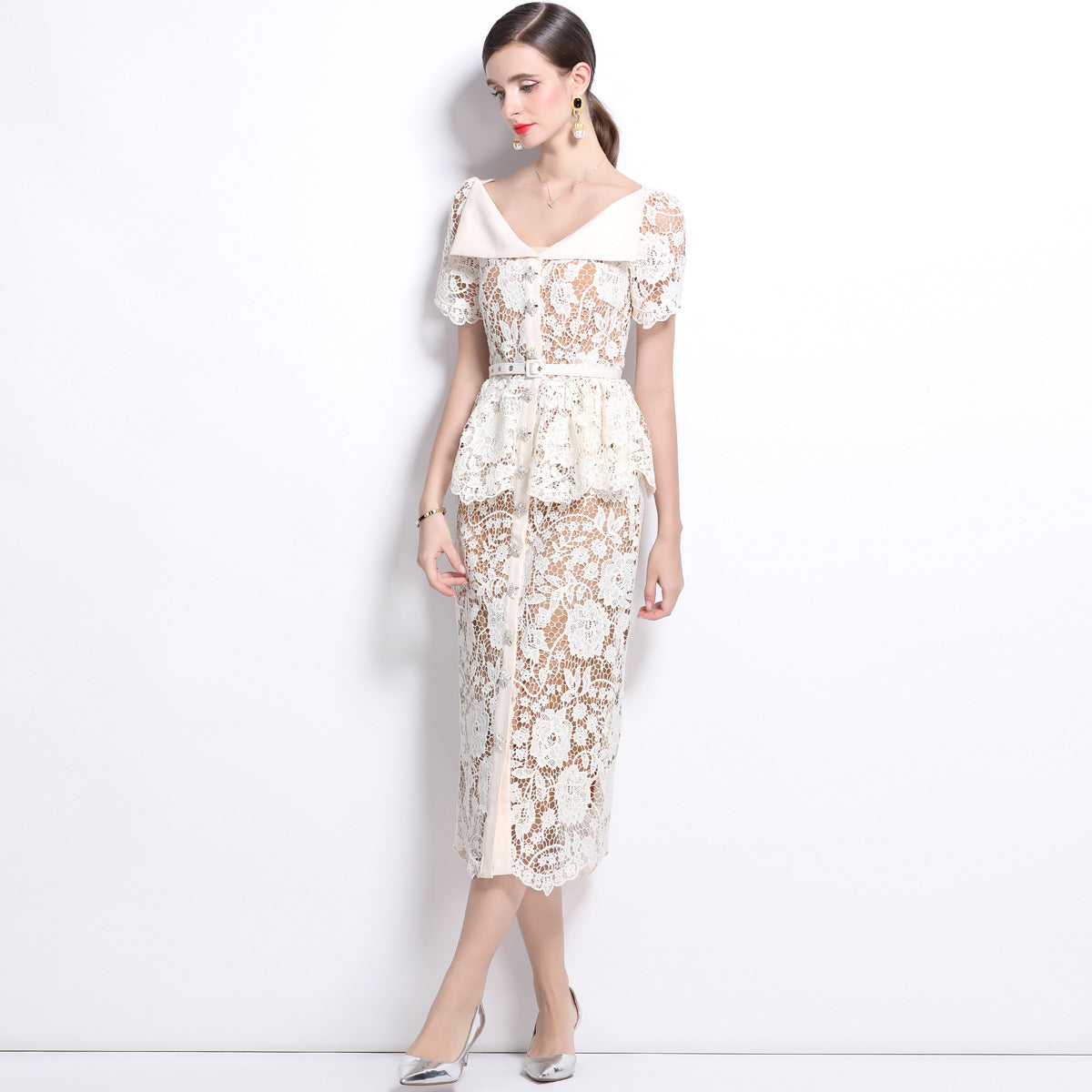 Diynav Niche Temperament Thousands Of Gold Windy Collar Short-Sleeved Lace Waist Dress Dress With Belt
