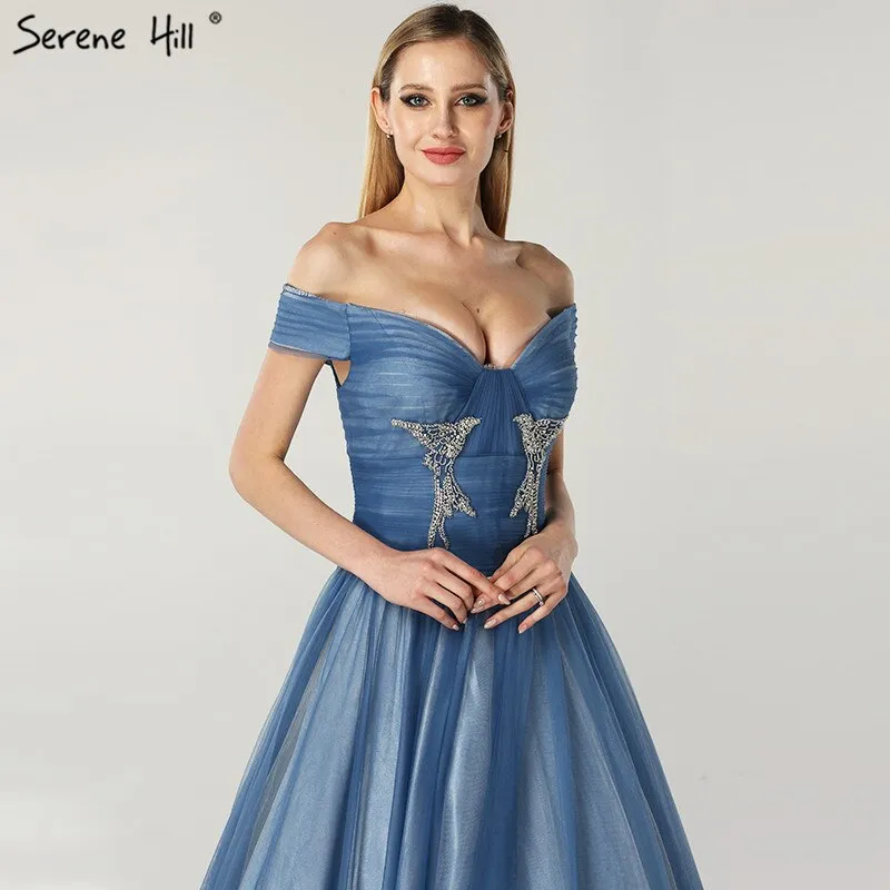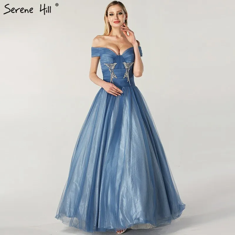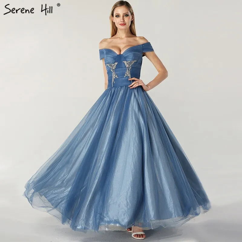 On Sale no return no refund Sale Blue Off Shoulder Sexy Ball Gowns Evening Dresses 2025 Tulle Beading Crystal Sleeveless Evening Gowns LA6678