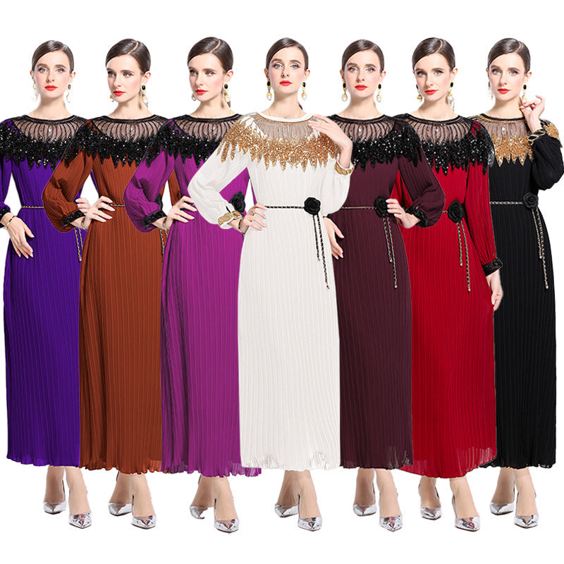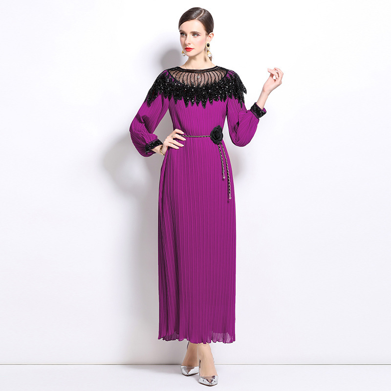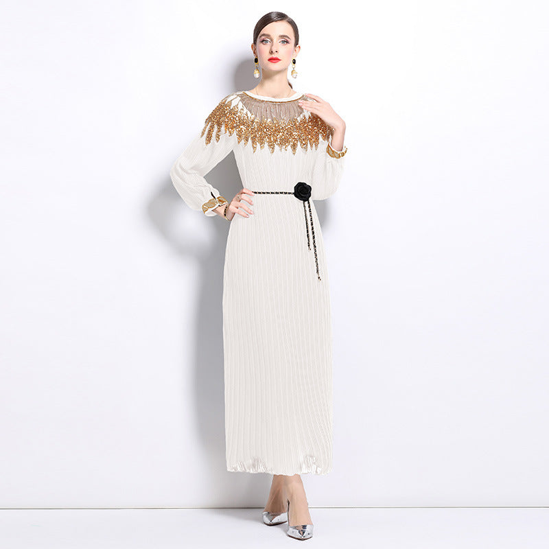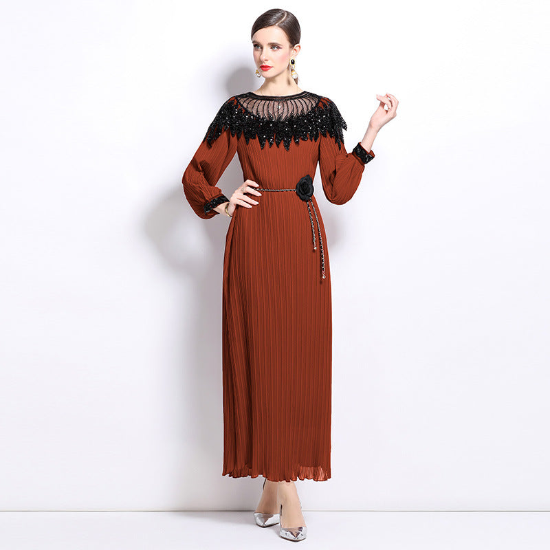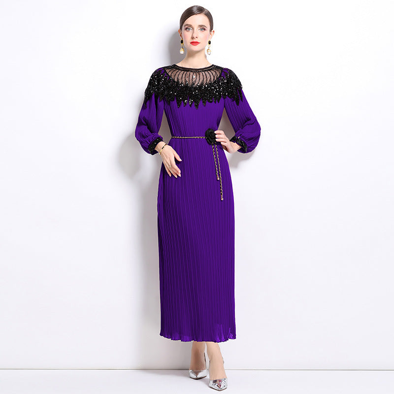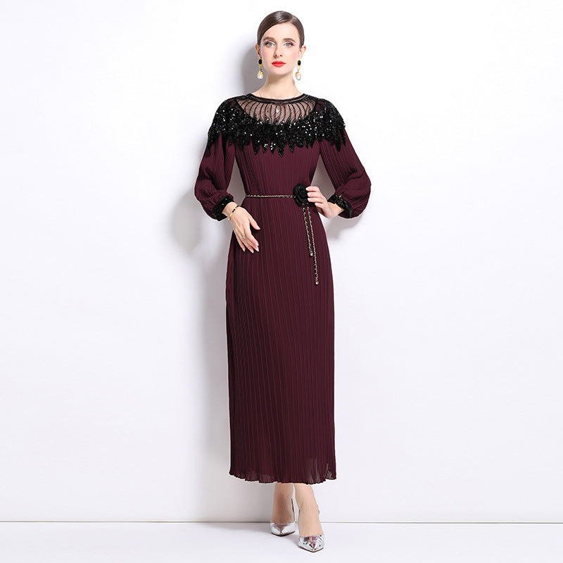 Diynav Senior Sense Of The Famous Fan Heavy Industry Nail Bead Dress Temperament Sister Fan Lantern Sleeves Loose Skirt