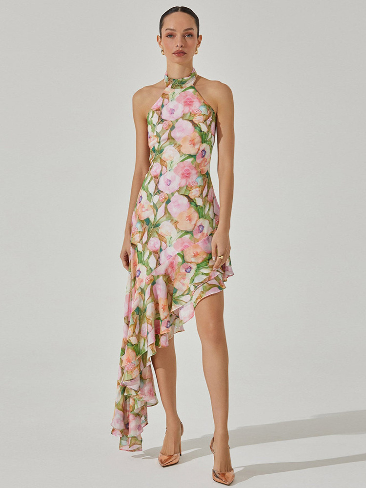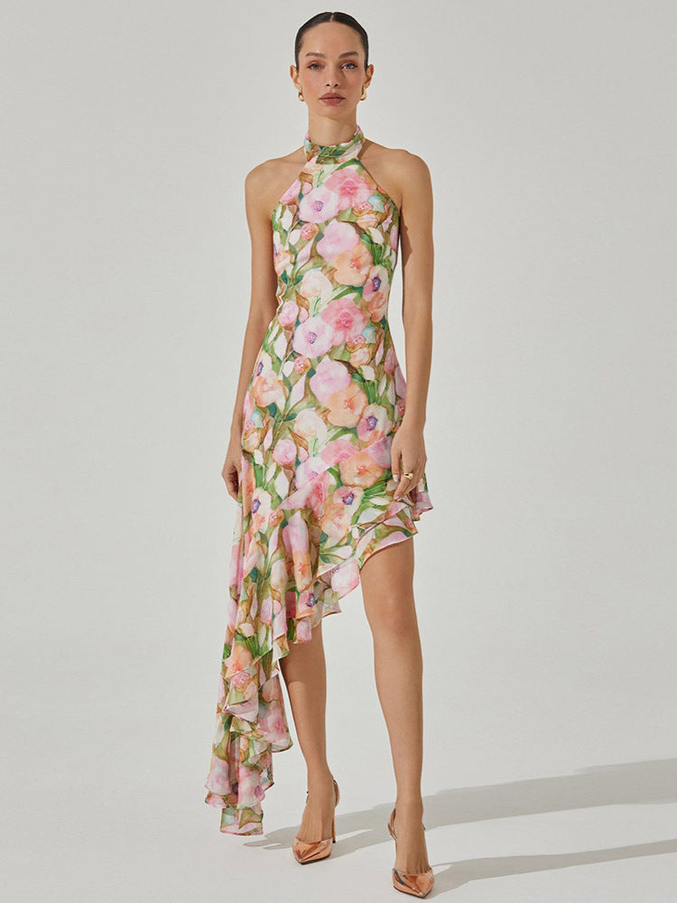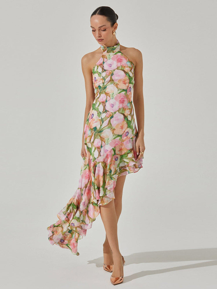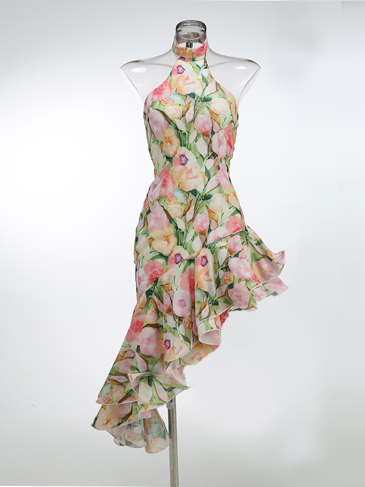 Diynav Sexy Shoulder Hanging Neck Print Dress In The Long Dress Irregular Lotus Leaf Side Temperament Dress Dress