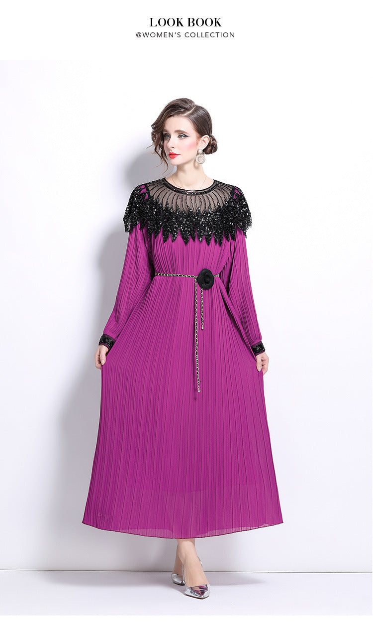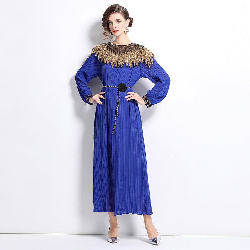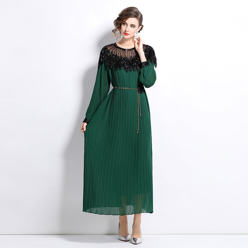 Diynav Women's Clothing 2024 New Heavy Industry Nail Polish Shiny Dress Temperament Lantern Sleeve Pressure Laminated Long Dress