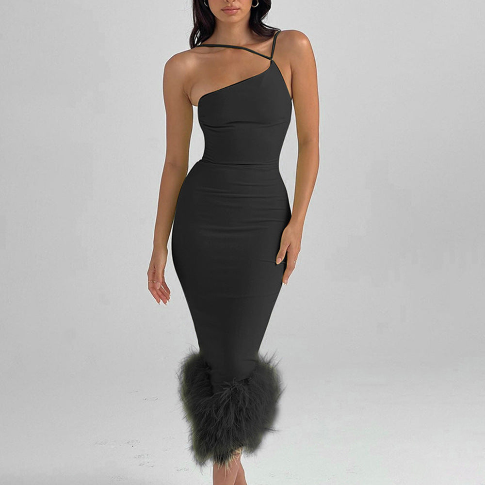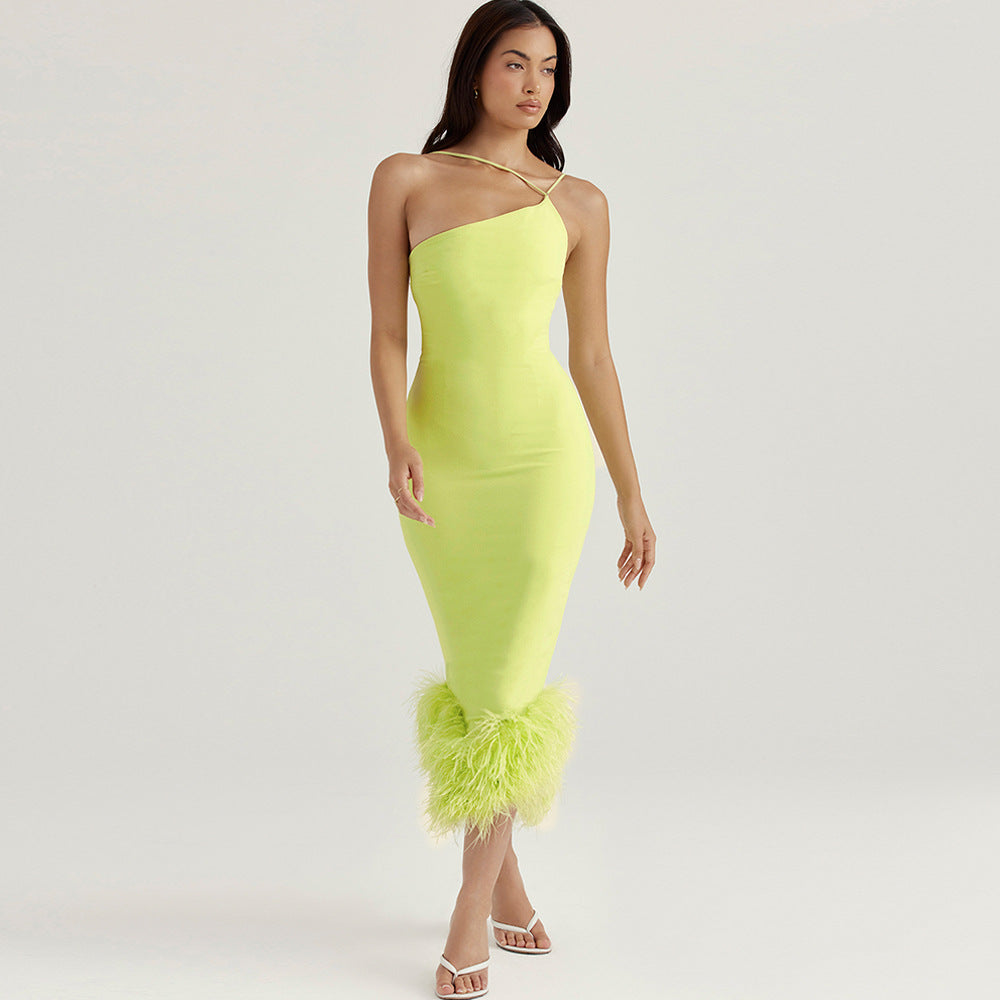 Diynav Women's Green French Sling Dress Women's Ostrich Hair Splicing Temperament High-End Thin Sling Skirt