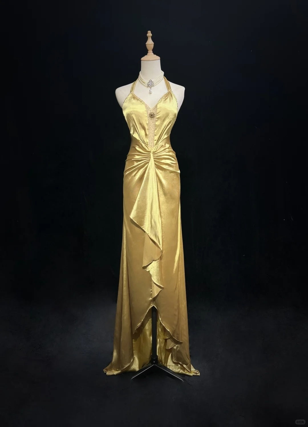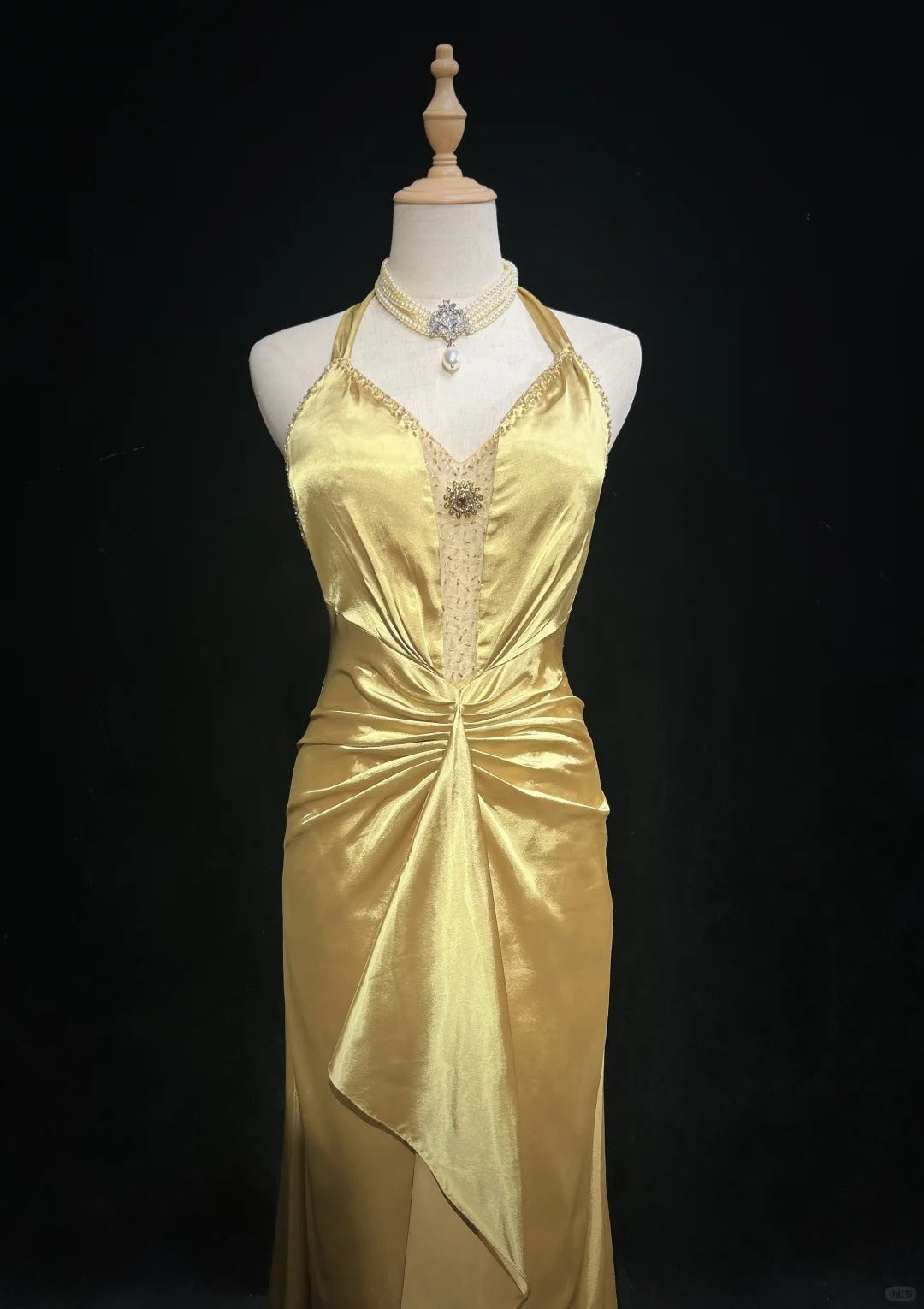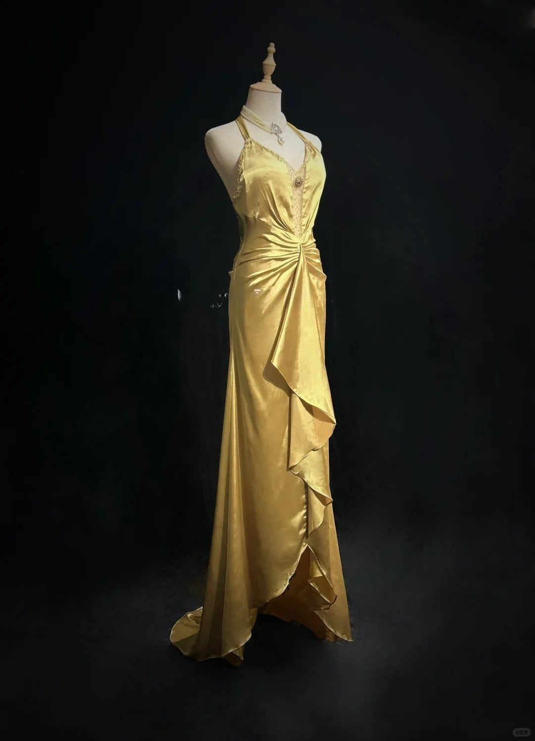 Elegant Yellow Halter Sheath Satin Long Prom Dresses Vintage Formal Evening Gowns HZ1108