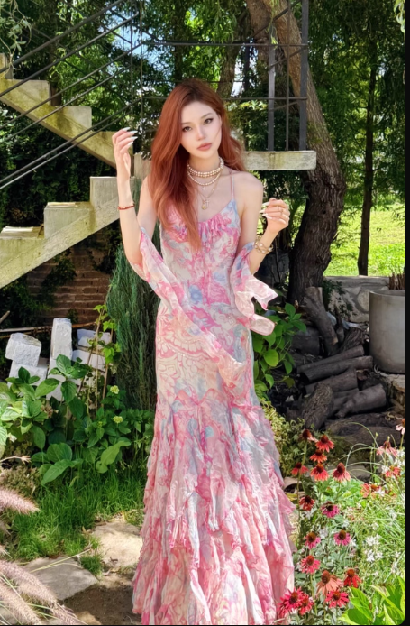 Fairytale Pink Spaghetti Straps Printed Chiffon Mermaid Prom Dresses Vintage Backless Evening Gowns HZ1108