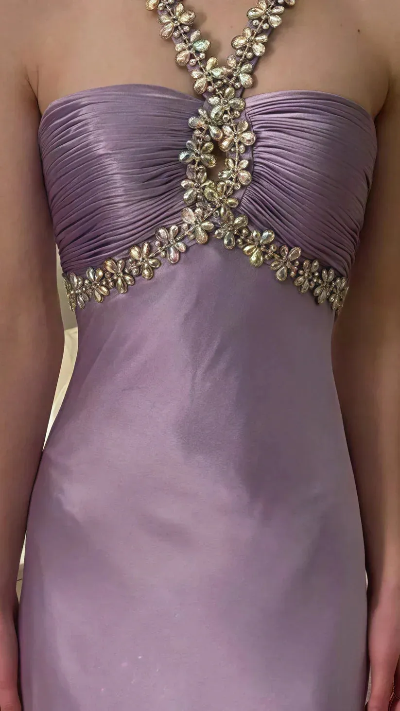 Gentle Purple ??Satin Beaded Backless Long Prom Dress for Pool Party&Birthday Sexy Evening Dresses