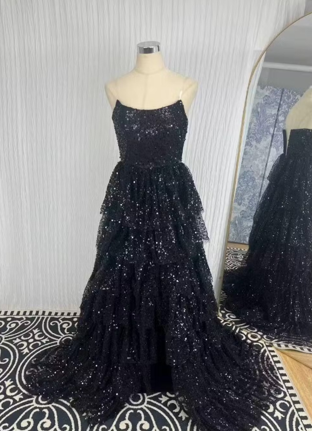 Shiny Black Strapless A-Line Sequin Slit Long Prom Dresses Formal Evening Gowns HZ1108